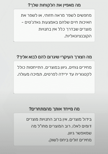 מחירים נוחים, גיוון במוצרים, התייחסות כולל לקטגוריה עד ירידה לפרטים, תמיכה מעולה.